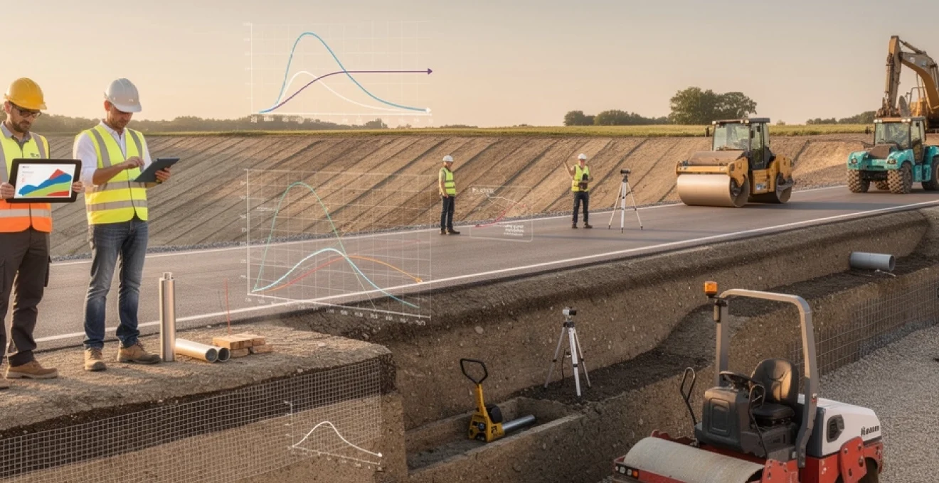 Le respect de ces pentes lors de la mise en œuvre et du compactage est contrôlé par des relevés topographiques réguliers. Il ne s’agit pas seulement d’une question de conformité géométrique, mais d’un enjeu de stabilité à long terme. Des zones planes ou en cuvette favorisent l’infiltration excessive et la saturation des couches supérieures, avec un risque accru de pompage sous trafic. En anticipant ces pentes dès la phase de terrassement, vous réduisez d’autant les interventions correctives ultérieures et sécurisez la durabilité de vos remblais.